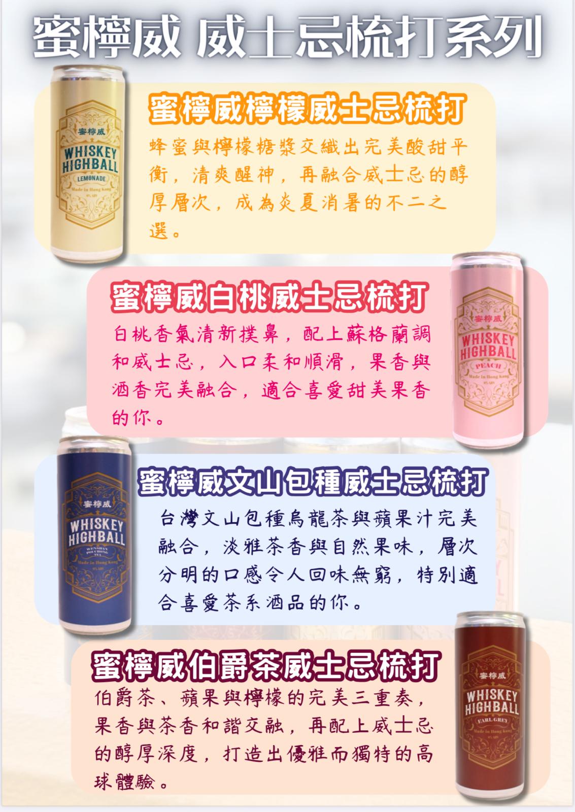 *蜜檸威檸檬威士忌梳打 (香港製造) Lemonade Whiskey Highball (Made in HK) 6% (1 x 24 x 330ml) *蜜檸威桃味威士忌梳打 (香港製造) Peach Whiskey Highball (Made in HK) 6% (1 x 24 x 330ml) *蜜檸威文山包種威士忌梳打 (香港製造) MLW Wenshan Pouchong Whiskey Highball (Made in HK) 6% (1 x 24 x 330ml) *蜜檸威文山包種威士忌梳打 (香港製造) MLW Wenshan Pouchong Whiskey Highball (Made in HK) 6% (1 x 24 x 330ml)