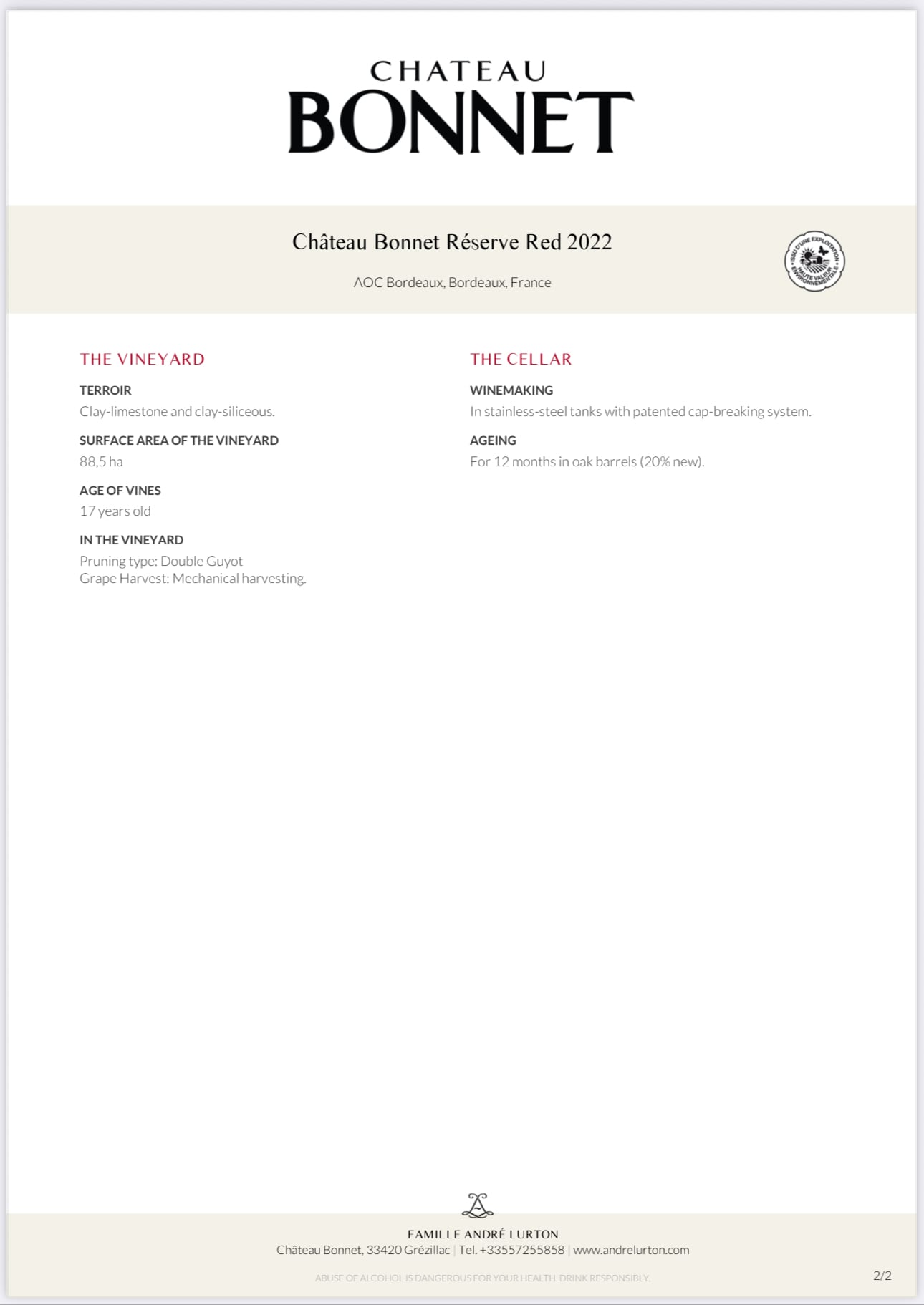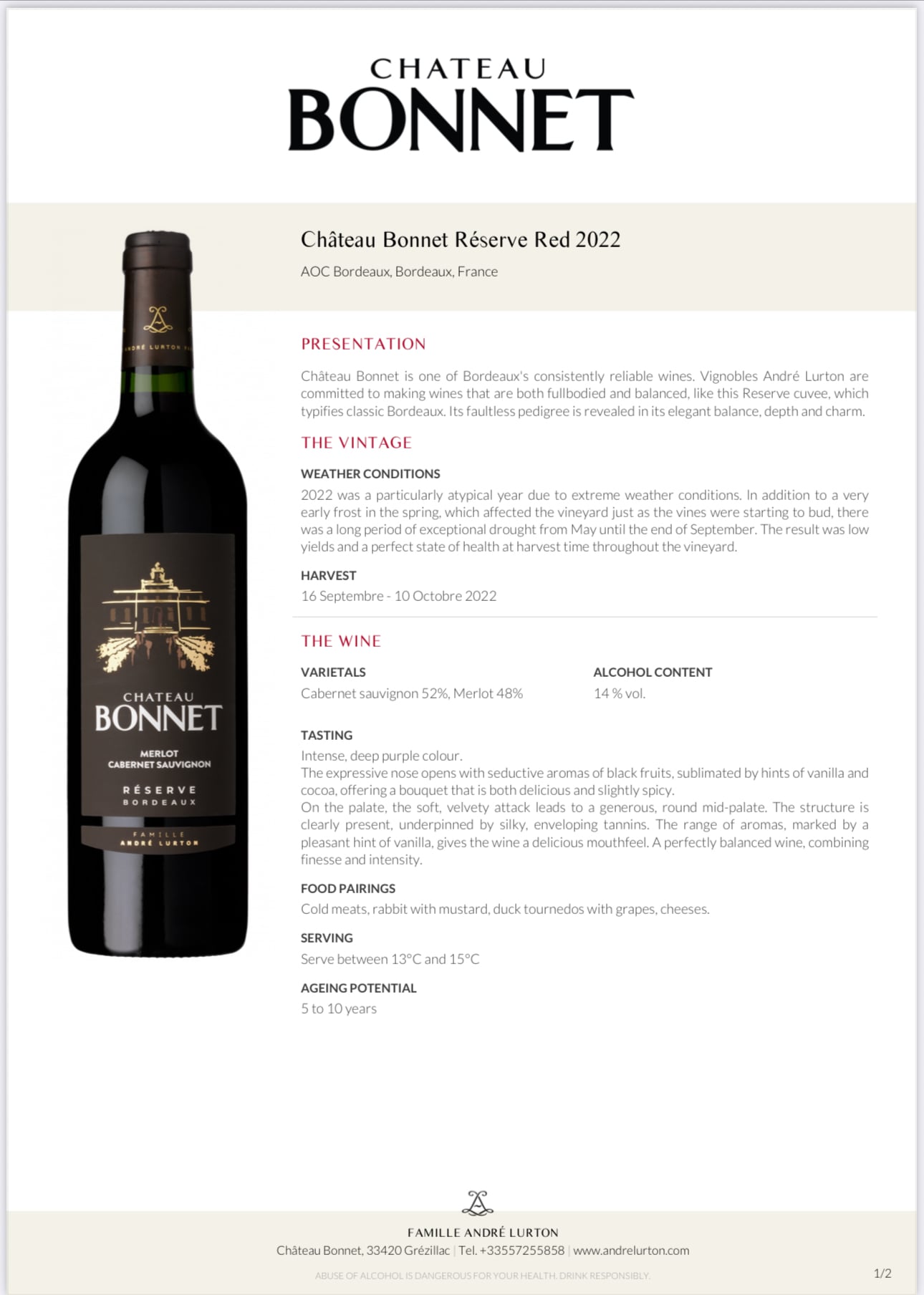博內酒莊(Château Bonnet)是波爾多品質始終如一的佳釀之一。安德烈·盧頓酒莊(Vignobles André Lurton)致力於釀造酒體飽滿、口感平衡的葡萄酒,例如這款珍藏佳釀,堪稱經典波爾多葡萄酒的典範。其優雅的平衡感、深邃的層次感和迷人的魅力,無不彰顯其純正的血統。