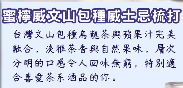 蜜檸威⽂⼭包種威⼠忌梳打 MLW WENSHAN POUCHONG WHISKEY HIGHBALL 台灣⽂⼭包種烏⿓茶與蘋果汁完美融合, 淡雅茶⾹與⾃然果味,層次分明的⼝感令 ⼈回味無窮,特別適合喜愛茶系酒品的 你。 Taiwanese Pouchong oolong tea blends with apple juice, creating a delicate aroma with complex flavors. 330mL